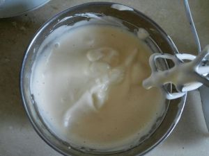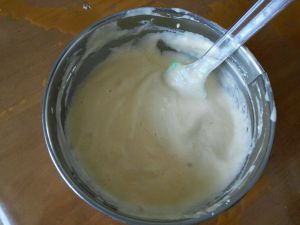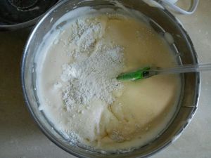 把面粉分两次筛进盆内,用上下翻拌的手法拌匀(千万不要划圈拌会消泡的)每次拌好再加下次。