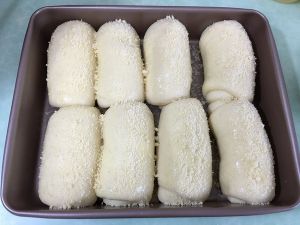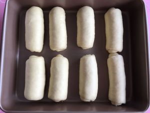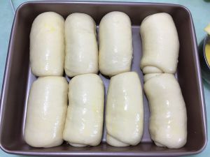 其它面团也是同样方法整形好,放入烤盘中,用烤箱发酵功能进行二次发酵,烤箱中放入一碗温水,时间大概35左右。