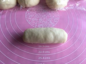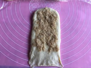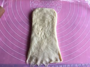 醒面结束后,取一块面团,擀成长方形后翻面,底部按薄。
