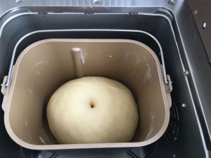 将面团重新整圆后放入面包机中,选择发酵解冻菜单进行一次发酵,时间设定为30分钟。