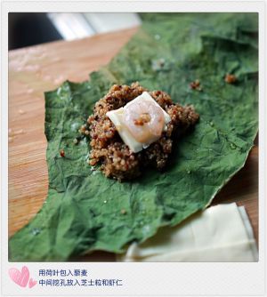 用荷叶包入藜麦,中间放入芝士粒和虾仁,裹起