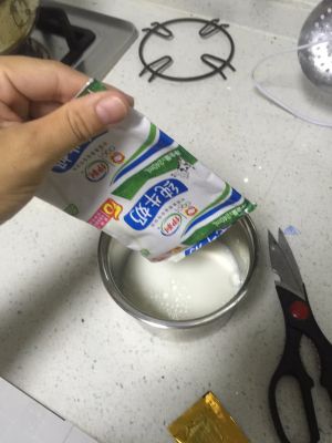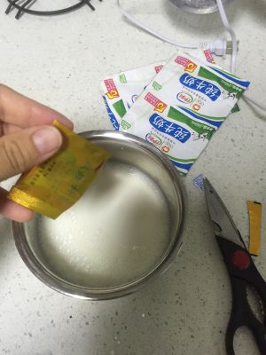 倒入1小袋酸奶菌粉,搅拌均匀,没有疙瘩。