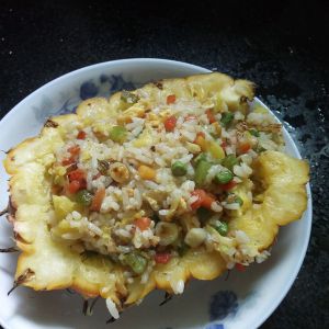 吵好后,放入米饭,我用的是剩饭。最后再放菠萝,一起炒,放一点盐