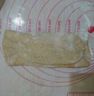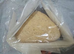 再对角对折成三角形,接口捏紧朝下,再稍整形成等边三角形,放在铺了油纸的烤盘上。用油纸多折几层,在面团外围成三角模定形,盖上保鲜膜进行二发
