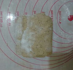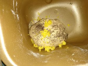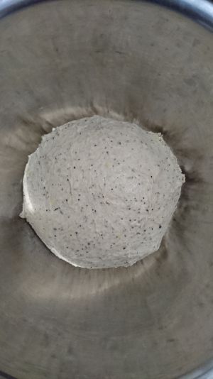 发酵面团和主面团完全和均后,加入柠檬皮屑和红茶末。我用的是亚曼的伯爵红茶包,拆开就直接是粉末。也可以用红茶叶,磨碎成粉