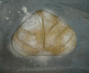 发至2倍大,取掉保鲜膜和慢慢撕下油纸,晾皮(晾完皮用手指轻触,不沾,一般十分钟左右)。筛粉,割包(用锋利的刀片,与面包45度角快速割裂,割完一道后把刀刃放在面粉里沾一下再割第二刀)