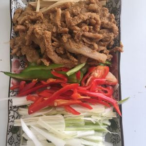 照片忘拍了,五花肉切丝,放甜面酱蚝油腌制15分钟