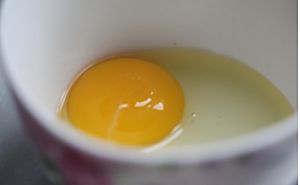 将融化的黄油、打散的鸡蛋液(蛋液要留一点)、细砂糖在大碗中混合均匀稍微搅打一下