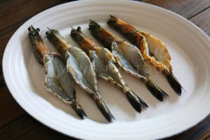 明虾去虾须虾枪,开背取虾线,撒上少许盐和胡椒粉备用;