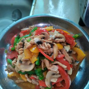 油锅下三丝甜椒跟白蘑菇片,翻炒2分钟