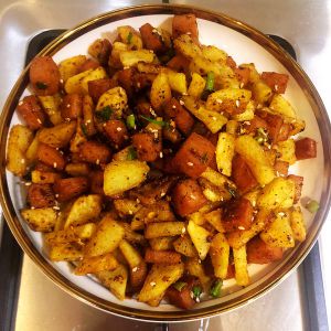 锅内油烧热后分别把土豆丁和午餐肉丁炸至表面金黄,没有午餐肉就火腿丁