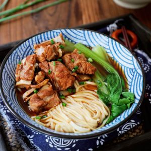 另起锅煮熟面条和青菜,盛出碗中,淋上红烧排骨汤和排骨即可