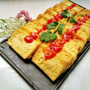 锅中豆腐块上的蛋液炸至凝固时,用铲子把豆腐块翻面再炸,炸至两面金黄外壳香脆时,捞出控干热油,整齐的放入菜盘中,全部炸完装盘后,用勺子舀起一些番茄酱,淋入炸黄的豆腐块上(也可将番茄酱装入小碗中,边蘸边食),一盘美食,鲜香四溢。