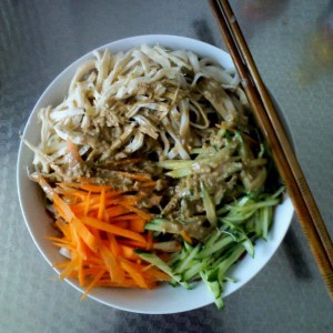 最后将菜码放在面条上,淋上酱汁,(也可以放炒熟的碎花生,我家没有了)可以开动了,是不是很有口感呢!