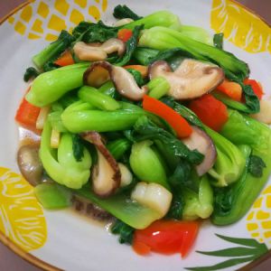 锅烧开水加入少许盐和油,倒入香菇焯水1分钟,再倒入油菜和红椒微微焯水捞出沥干水分,待用。