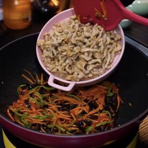 下入胡萝卜辣椒木耳丝,断生下肉丝炒匀出锅
