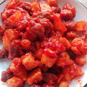 另外起锅,舀点油,一丢丢,倒入番茄酱,砂糖,炒均匀,放不放盐巴都可以,看自己之前腌的咸不咸,依次倒入炸好的肉块,土豆块,搅拌均匀,就可以出锅了,番茄酱随自己口味放,想有汤汁的炒番茄酱的时候可以加点开水,个人感觉没有不当水来的酥,如果是拿来拌饭根