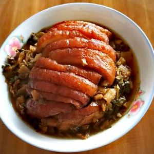 9铺上炒好的梅干菜,上锅蒸2小时。