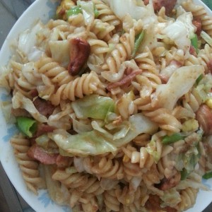 将煮熟的意大利面沥干水分,放入锅中加入沙茶酱,蚝油,在根据个人口味倒入适量盐,加入尖椒稍微炒一会,再放少量鸡精。