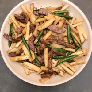 热锅冷油,小火,加入蒜片炒香,改中大火,放入牛排条炒至变色(八九成熟即可),放入杏鲍菇条。