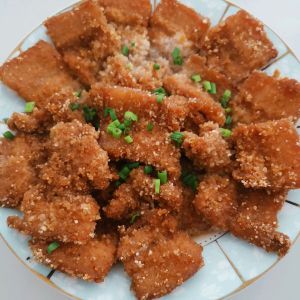腌好的肉片加两汤匙水,撒米粉拌匀