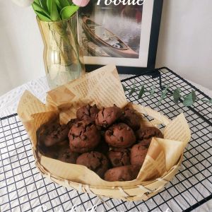2、筛入低筋面粉、可可粉、小苏打、刮刀用切拌的方法混合均匀至无干粉,加入巧克力豆混合均匀