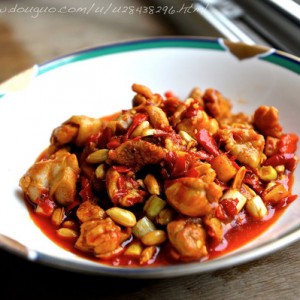 放入姜丁与辣酱,放入鸡丁炒。等鸡丁炒出汤放入糖,炒熟鸡丁后放入炸熟去皮的花生米与葱段,淋上少许红油,烹入少许香醋即可出锅