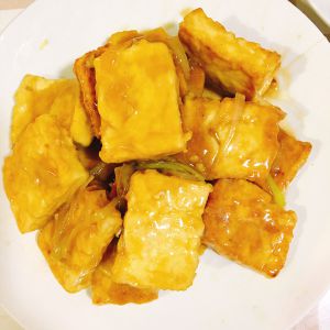 小火放入油,把汁放入油锅中,加入葱丝,翻炒几下,在勾芡,整体弄完再放入煎好的豆腐快速翻炒几下出锅