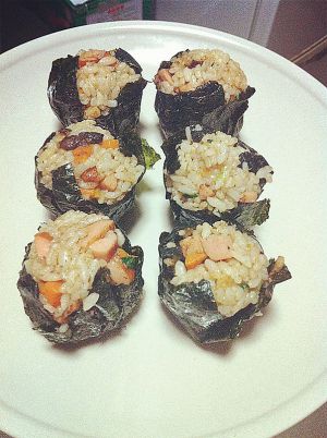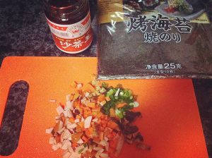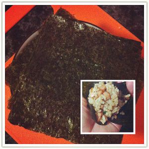 接着海苔在二分之一处对剪两次,变成四张正方形,然后包入米饭