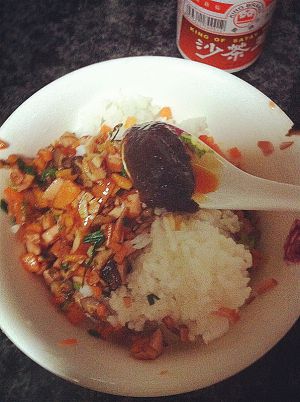然后把炒好的材料放入剩米饭里接着加入一勺沙爹酱一点点的盐拌一拌