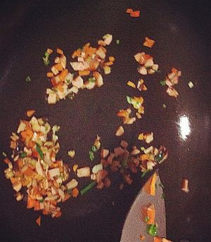 准备好材料,胡萝卜,小虾干,热狗肠,葱都切碎