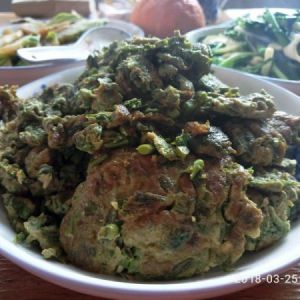 香椿焯水,切碎,放入打好的鸡蛋,加入一小勺盐,搅拌均匀。