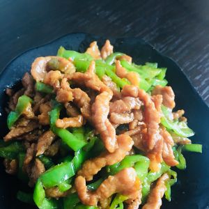 锅里留油,下入青椒爆炒,等青椒变色,加入肉丝翻炒均匀,装盘出锅