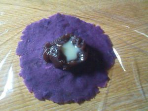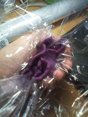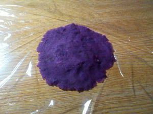 保鲜膜放于于桌面 取适量紫薯泥如图铺成圆饼状(中间打底要厚些哦 周边要薄些-做包子的原理\(^o^)/)