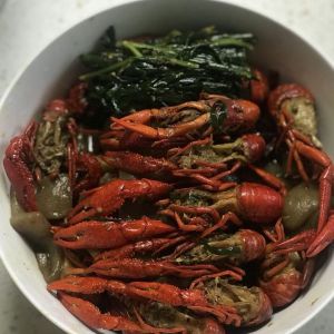 放比炒菜时的油多一点,关小火炒花椒,干红辣椒,爆出香味加少许姜片,放虾翻炒至红色,再加两大勺料酒,酱油,八角,咖喱粉,大蒜,盐,继续翻炒2分钟