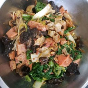 放火腿肠、午餐肉翻炒,放配菜大火翻炒,放盐等调料炒匀。