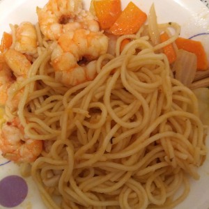 锅不用洗,继续倒油,烧热,倒入洋葱和胡萝卜片翻炒2mins,加入沥水的乌冬面翻炒,加入意大利面酱(番茄罗勒风味),翻炒2mins出锅。