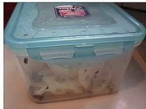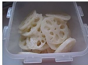 将焯过水的藕片放在一个密闭的容器中,调入盐、醋、糖