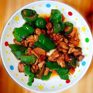 5.再放入青椒,来回翻炒!放入葱,蒜片,来回翻炒,至肉熟,青椒香脆就可以出锅了!