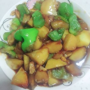 放入茄子,土豆炒一下,放入料汁,中火收一下汁。