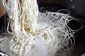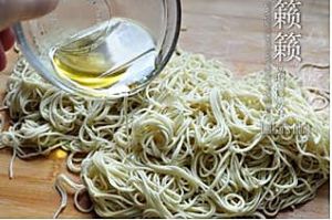 取口大锅加入足量清水煮开,将面条投入锅中煮至断生,捞出沥干水放在案板上抖散快速降温,撒上少许特制花椒油(见备料①)用筷子将其挑匀,夏天建议将拌油过后的面条放置电扇前散热吹凉、将其水分收干备用(水分收干的面条才能挂汁饱满,入味十足);