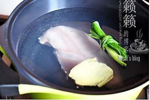 将鸡胸肉放入锅水加入清水,生姜切1片拍松、小葱1根挽成葱结投入锅中,淋上少许料酒中大火煮开锅,继续煮5分钟左右熄火不揭盖焖3-5分钟,将鸡胸肉取出摊凉备用;