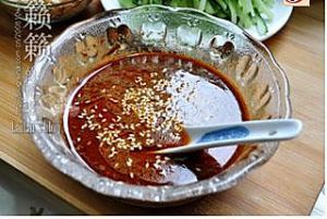 取1小碗,芝麻酱2勺用姜蒜水(见备料②)化开,碗中添加盐少许、酱油1勺、辣椒油1勺、花椒油1勺、花椒粉辣椒粉适量、糖1茶匙、醋1勺、香麻油1勺,将碗中作料充分拌匀后撒上1小勺炒香芝麻备用;豆芽垫底,放上凉面,再把鸡丝和黄瓜丝摆在面条上,铺上姜茸蒜茸,撒上花生碎,将拌汁淋上撒上葱末即可上桌。