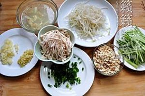 将摊凉的鸡胸肉手撕成丝备用;油炸花生米去皮碾碎备用;绿豆芽洗净掐去头尾滚水中焯至断生挤干水分备用;黄瓜洗净切丝备用;将剩余的1/2份蒜瓣、生姜切成蒜茸、姜茸备用;小葱洗净切末备用;