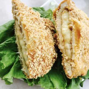 鸡脯肉切片,中间片开别切断,粘干淀粉