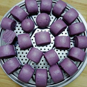 紫薯切小块蒸熟,压成泥,趁热加入白糖搅拌。酵母用一点温水调开,静置5-10分钟,把酵母水和紫薯泥加入面粉,用筷子搅拌混合,然后用手揉成面团。