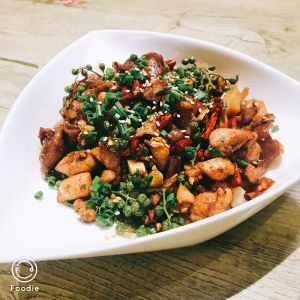鸡丁大火热油炒熟,倒入切好的配料,翻炒均匀,再加入肥肠。出锅加入葱段、芝麻装饰。