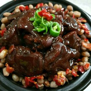 猪手捞出,摆入马斗中,放入蒸好的花生米,倒入湖南剁椒,倒入原汁,入蒸箱蒸五分钟即可