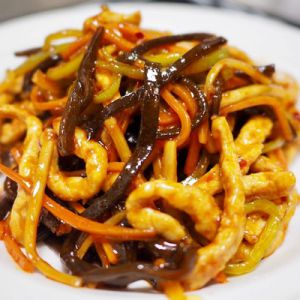 干木耳温水泡发后与冬笋、胡萝卜切丝焯水,捞出备用。
