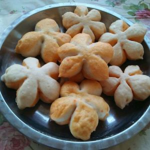按扁面团,用剪刀剪十字口,中间不剪断。